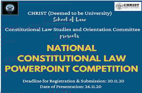 School of Law, CHRIST (Deemed to be University) is organising a PPT competition virtually (Cisco Webex) on a pan India scale to celebrate the 71st National Constitutional Law Day on 26th November 2020 (Thursday).