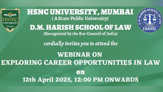 DM Harish School of Law (DMHSL), Hyderabad Sind National College (HSNC) University, will be hosting a free webinar on 'Exploring Career Opportunities in Law' on April 12, 2025.