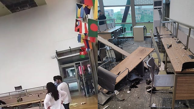 Multiple videos have surfaced online showing faulty plumbing, an AC unit reportedly having exploded and a part of the ceiling component collapsing upon empty benches in the Global Library reading room.