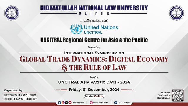 An International Symposium on 'Global Trade Dynamics: Digital Economy and the Rule of Law' was recently held on December 6 by the Hidayatullah National Law University (HNLU), Raipur's Centre for WTO and WIPO Studies, School of Law and Technology in collaboration with the UNCITRAL's Regional Centre for Asia and the Pacific (RCAP).