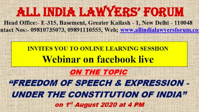 A webinar on the theme, "Right to Speech and Expression under the Constitution of India" is being organised this weekend by the All India Lawyers Forum.