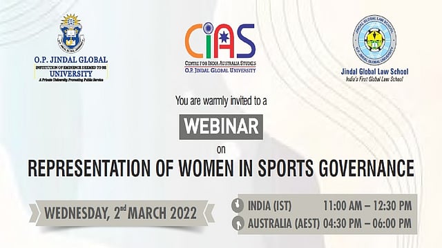 The Centre for India Australia Studies (CIAS) and O.P. Jindal Global are organizing an exciting webinar on 'Representation of Women in Sports Governance' scheduled for Wednesday, 2 March 2022 between 11:00 AM- 12:30 PM (IST).