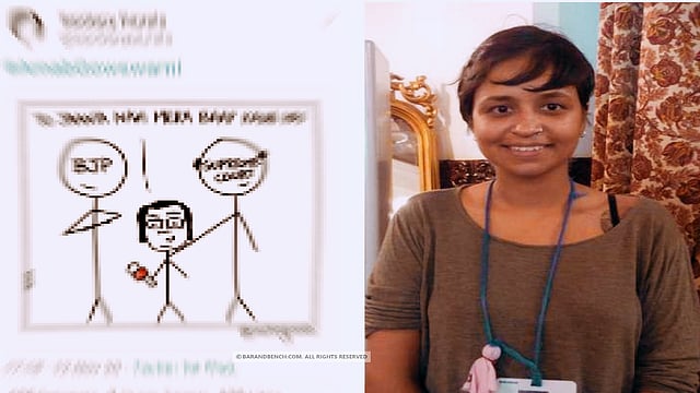 After the Supreme Court granted interim bail to journalist Arnab Goswami, Taneja, who operates the twitter handle @sanitarypanels, tweeted a cartoon depicting the BJP, the Supreme Court, and a reporter with the text "Tu Janta Nahi Mera Baap Kaun Hai" (you don't know who my father is).
