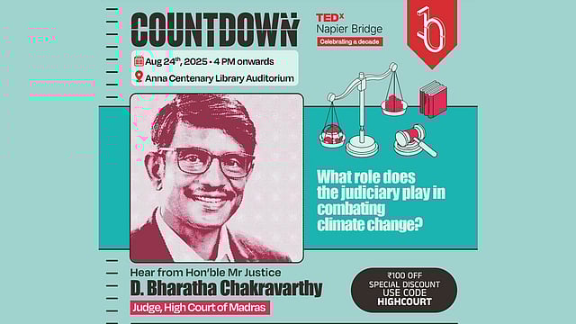 Madras High Court judge, Justice Bharatha Chakravarthy will be giving a TEDx talk as part of TEDxNapier Bridge on August 24, 2025, Sunday, at Chennai on the theme, "What Role does the Judiciary play in Combating Climate Change?"