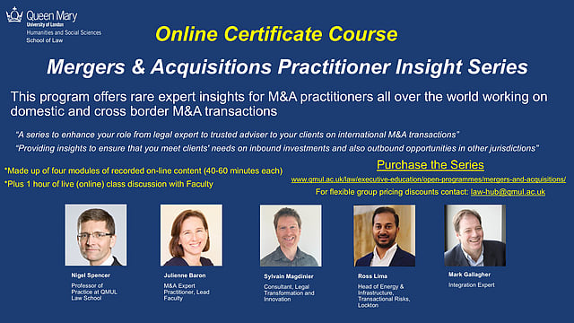 The QMUL “M&A Practitioner Insights Series” online certificate course offers the opportunity to learn from senior practitioners with international experience for many years, sharing their practical learning of key elements of, and potential pitfalls in, the M&A process – insights which one cannot find in textbooks or online.