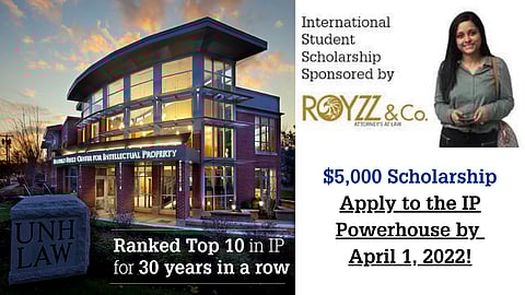 The International Student Scholarship, sponsored by Royzz & Co. Law Firm, provides a $5,000 scholarship for one graduate student studying Intellectual Property law at the University of New Hampshire Franklin Pierce School of Law.